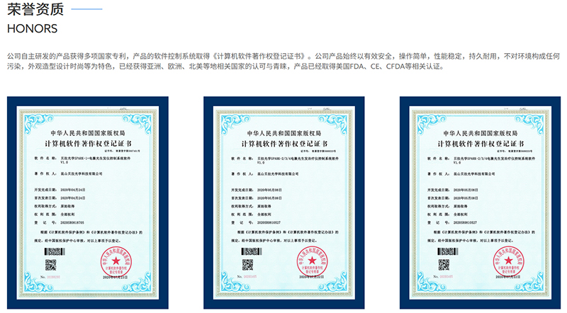 公司產(chǎn)品始終以有效安全,操作簡單,性能穩(wěn)定,持久耐用,不對環(huán)境構(gòu)成任何污染,外觀造型設(shè)計時尚等為特色,已經(jīng)獲得亞洲、歐洲、北美等地相關(guān)國家的認(rèn)可與青睞,產(chǎn)品已經(jīng)取得美國FDA、CE、CFDA等相關(guān)認(rèn)證,我們還將繼續(xù)前行!
